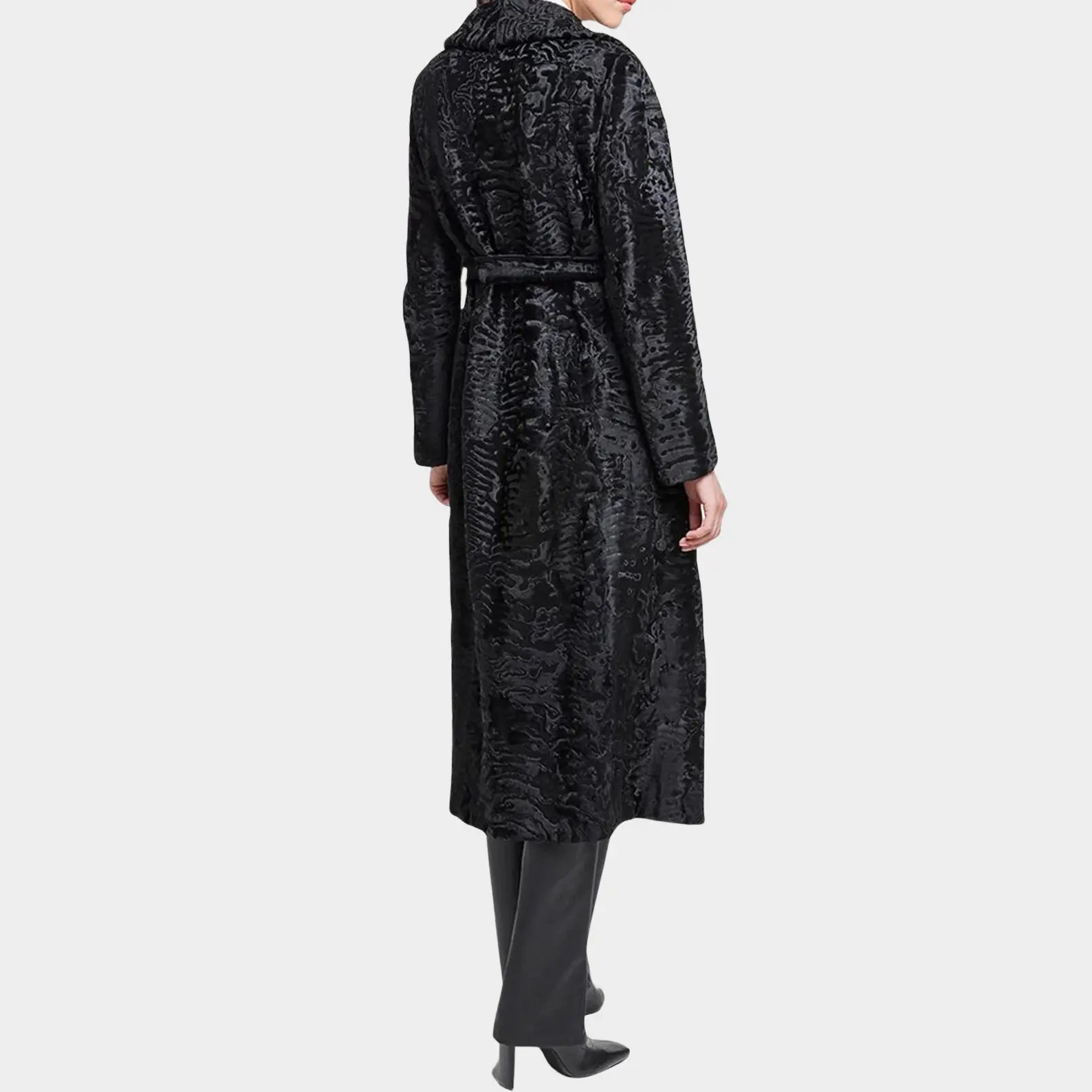 Step into timeless elegance with this exquisite Swakara Fur Coat in classic black. Designed in a vestaglia (robe-style) silhouette, this piece combines luxurious texture with a flattering belted waist, creating a refined and feminine shape.
