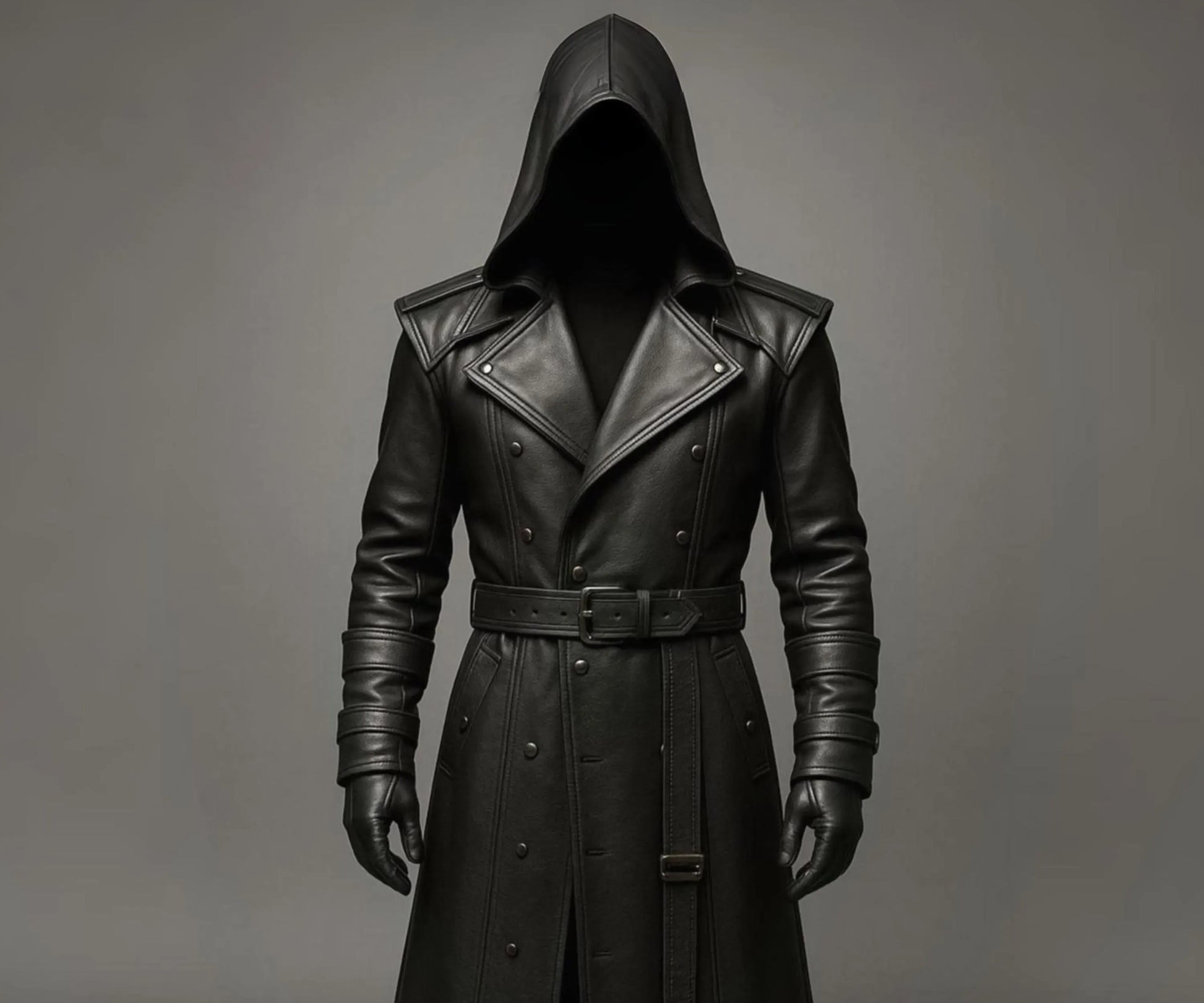 ✅ Features: • Handmade from high-quality genuine cowhide leather for a luxurious and durable finish. • Distinctive long trench coat design with a full-length cut for dramatic flair. • Attached hood for an extra layer of mystery and style – perfect for darkwear and streetwear looks. • Double-breasted front with a belted waist for a tailored, adjustable fit. • Metal hardware accents and detailed stitching that complement Gothic, Steampunk, and Cyberpunk fashion aesthetics. • Ideal for cosplay costumes, Renaissance fairs, Halloween, and alternative fashion. • Available in custom sizes for a perfect, made-to-measure fit.