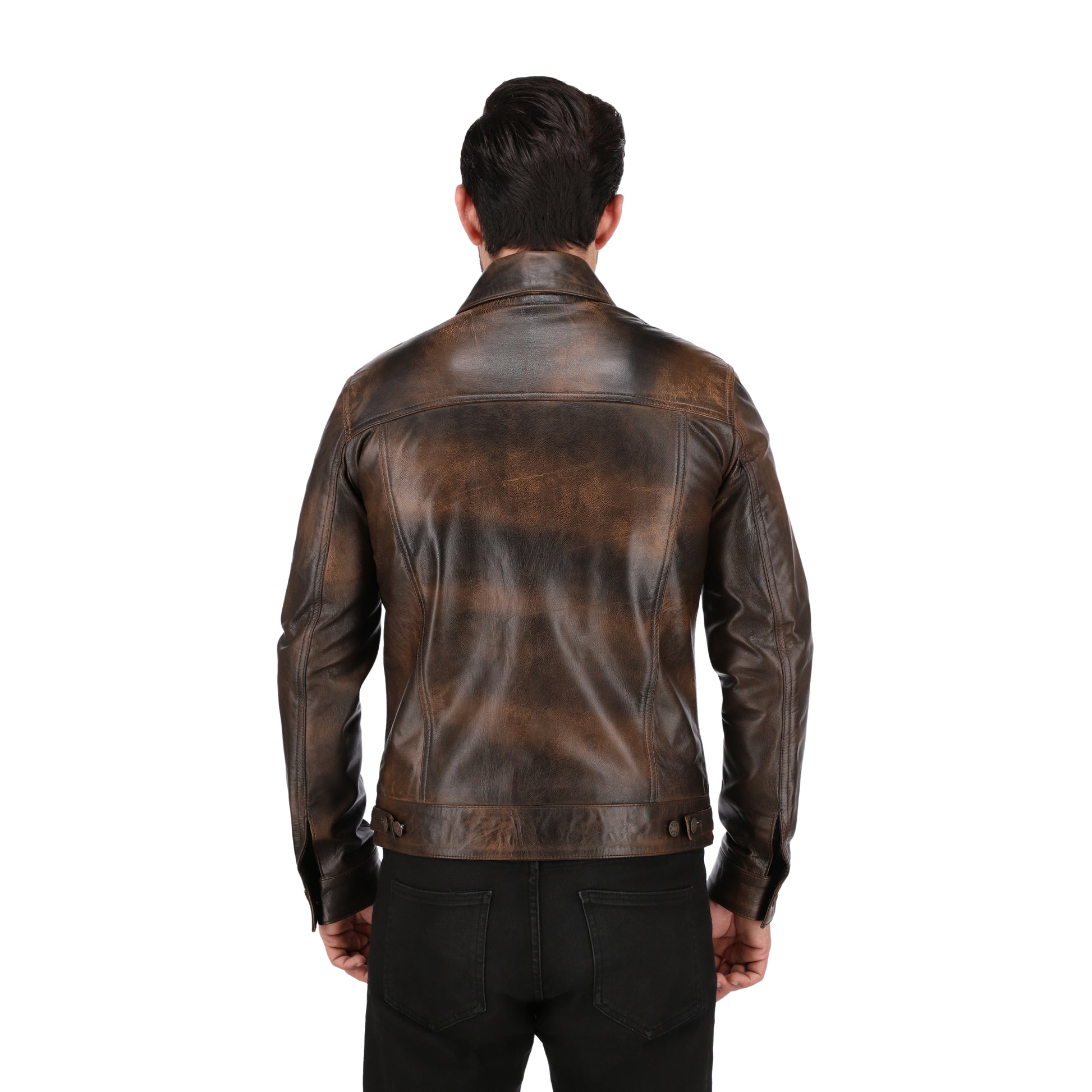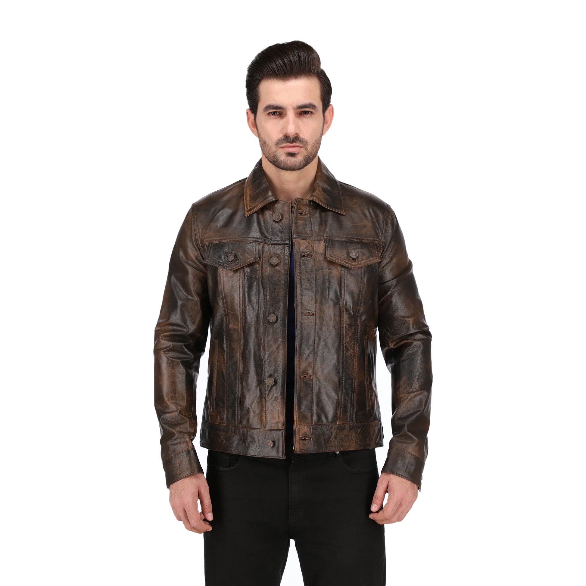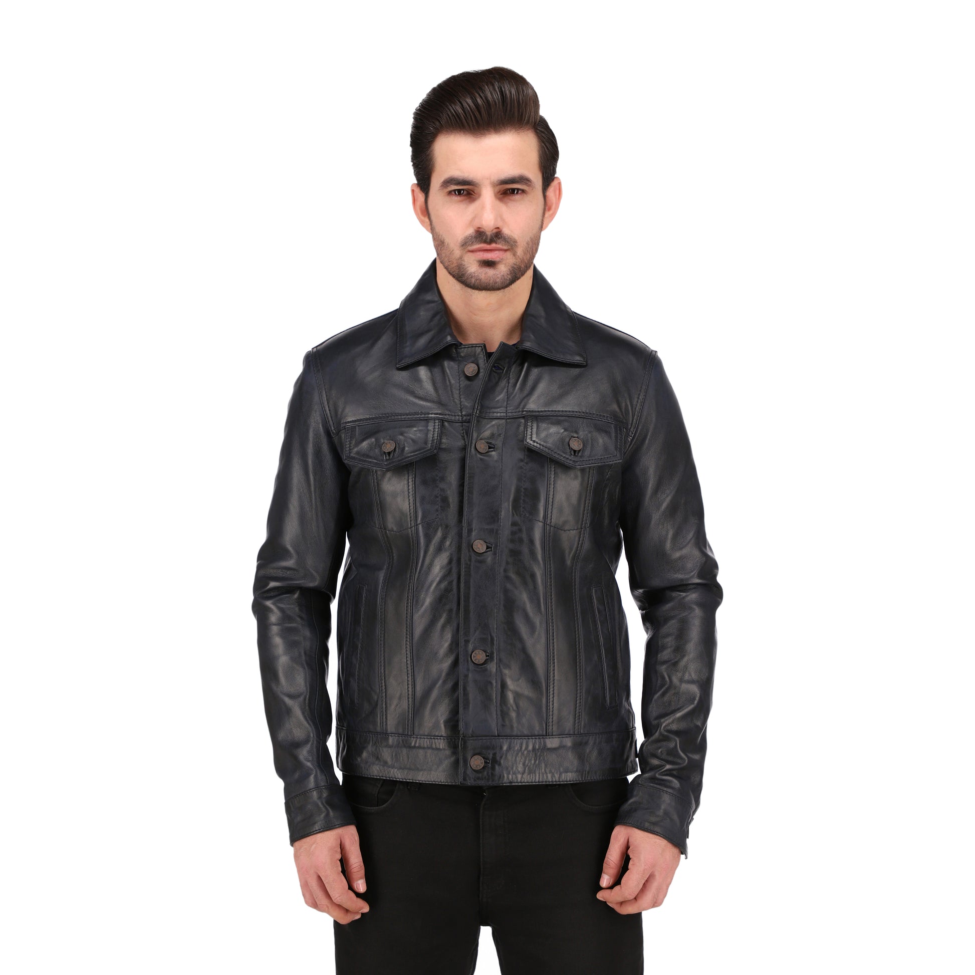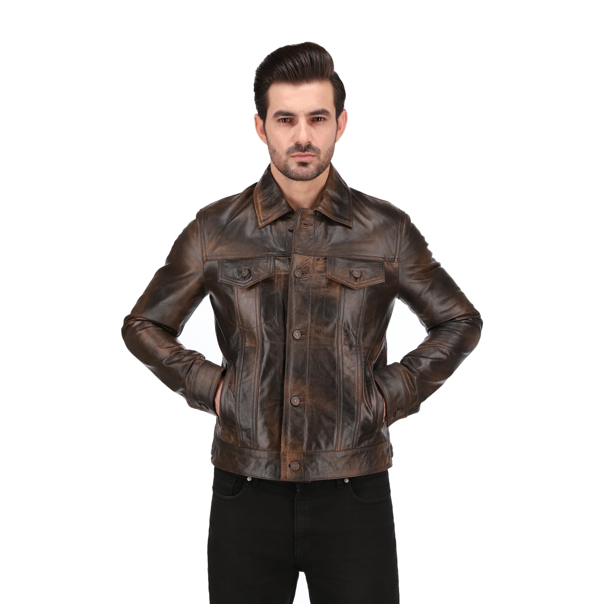 Mens Black Brown Real Lambskin Leather Trucker Jacket