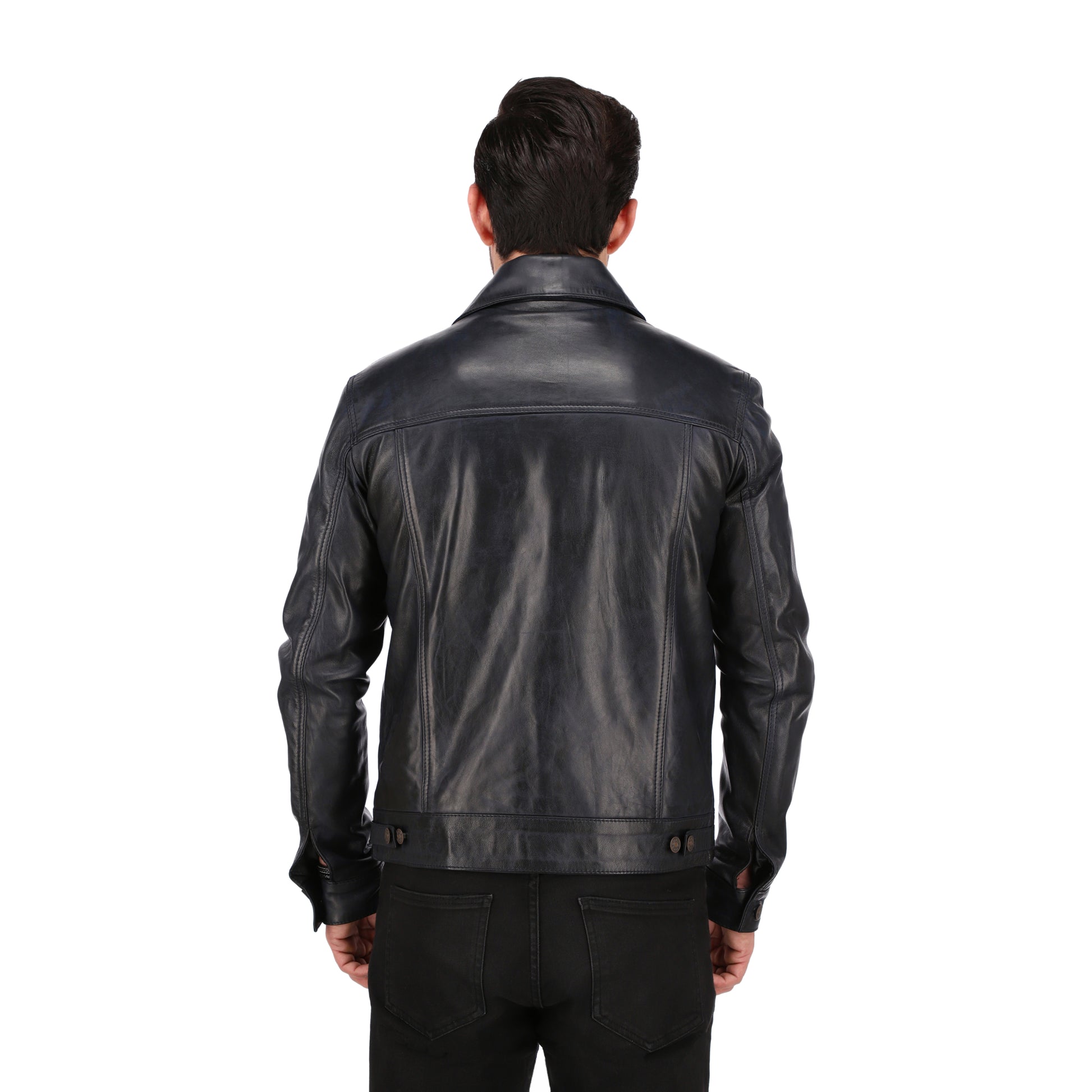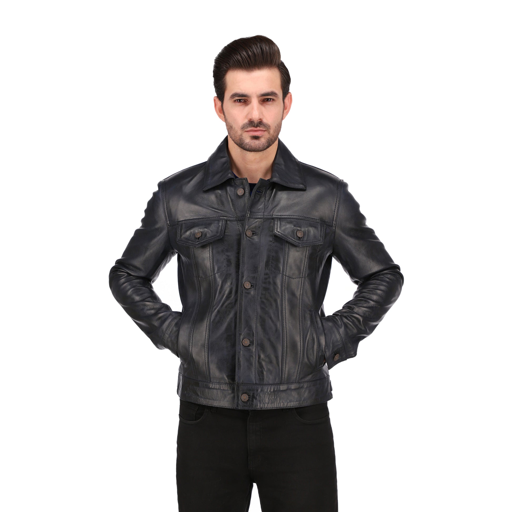 Step into the realm of rugged fashion excellence with the Mens Real Lambskin Leather Trucker Jacket. Skillfully tailored to embody a bold aesthetic, this jacket showcases a classic trucker design that radiates rugged charm.
