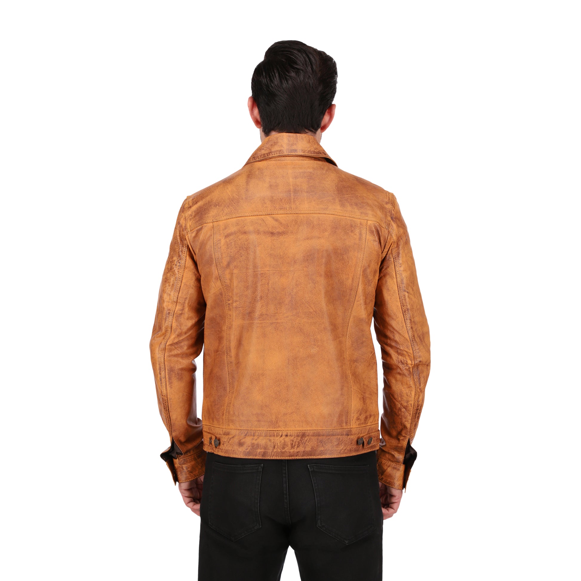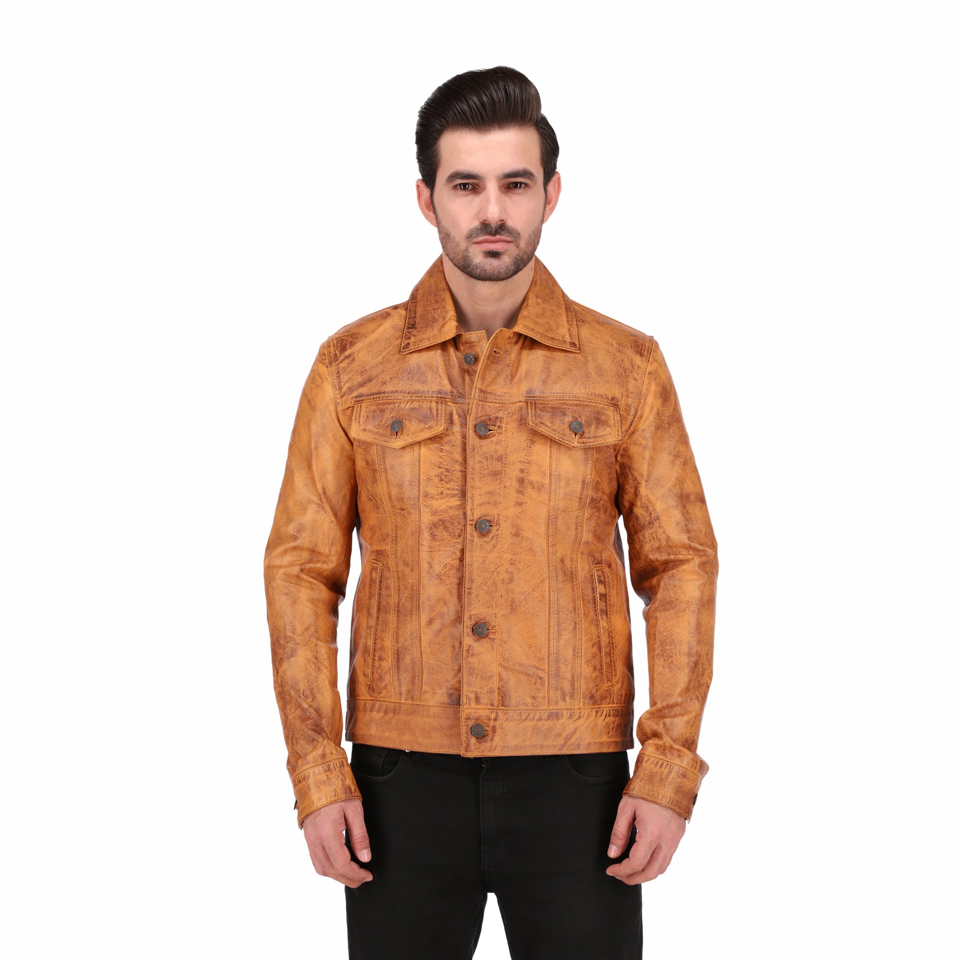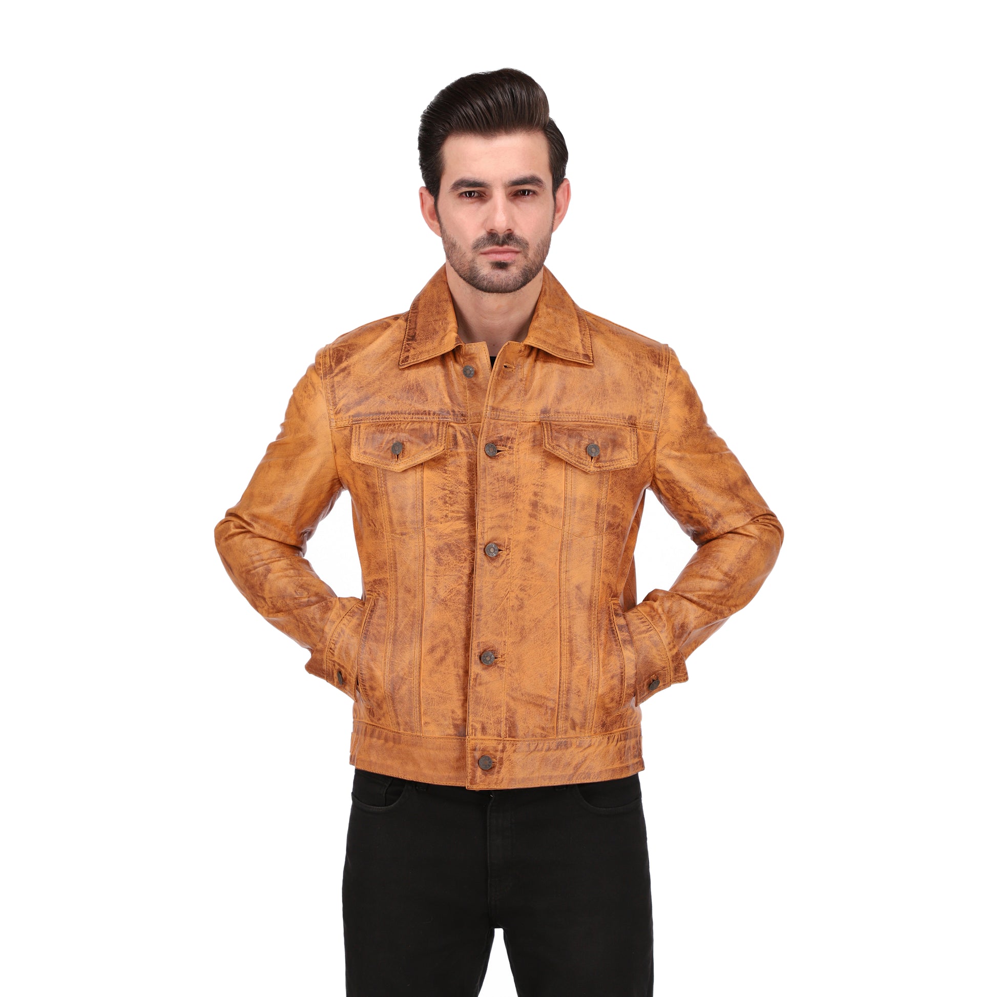 Mens Camel Brown Real Lambskin Leather Trucker Jacket