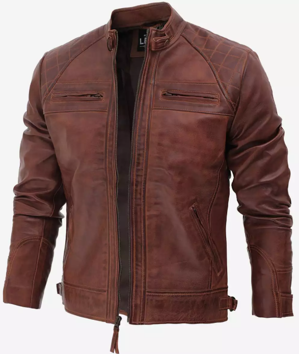 Step up your style with our Men's Café Racer Cognac Leather Jacket. This jacket features eye-catching quilted shoulders and is crafted from rich cognac leather, offering both durability and a sleek look. With practical zippered cuffs and pockets, it's perfect for any occasion, blending rugged elegance with modern simplicity. Versatile and stylish, this piece is a must-have for adding a touch of sophistication to your wardrobe.