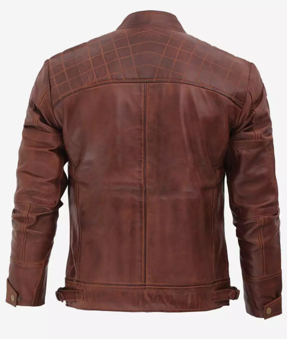 Men's Cafe Racer Cognac Leather Jacket - Quilted Shoulder