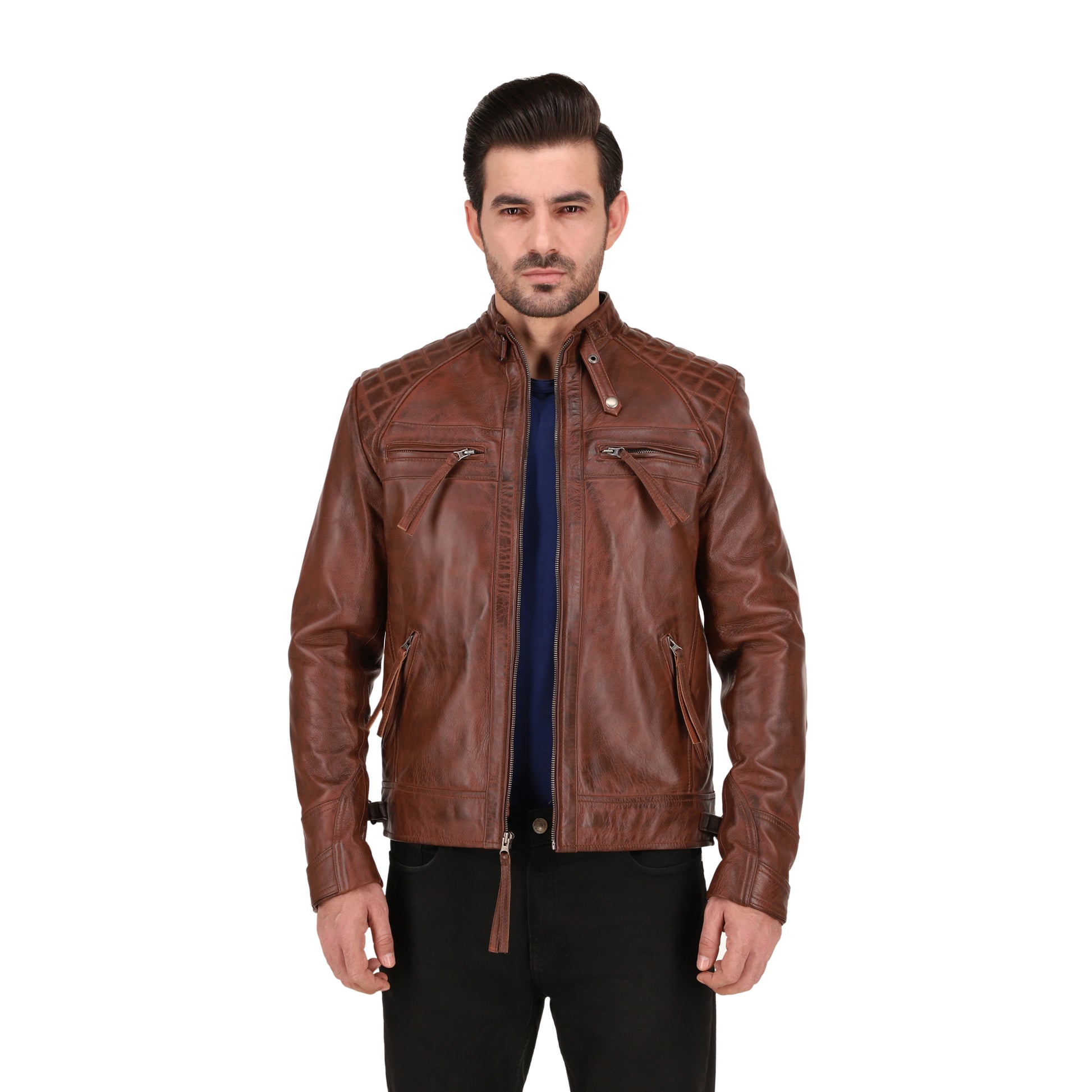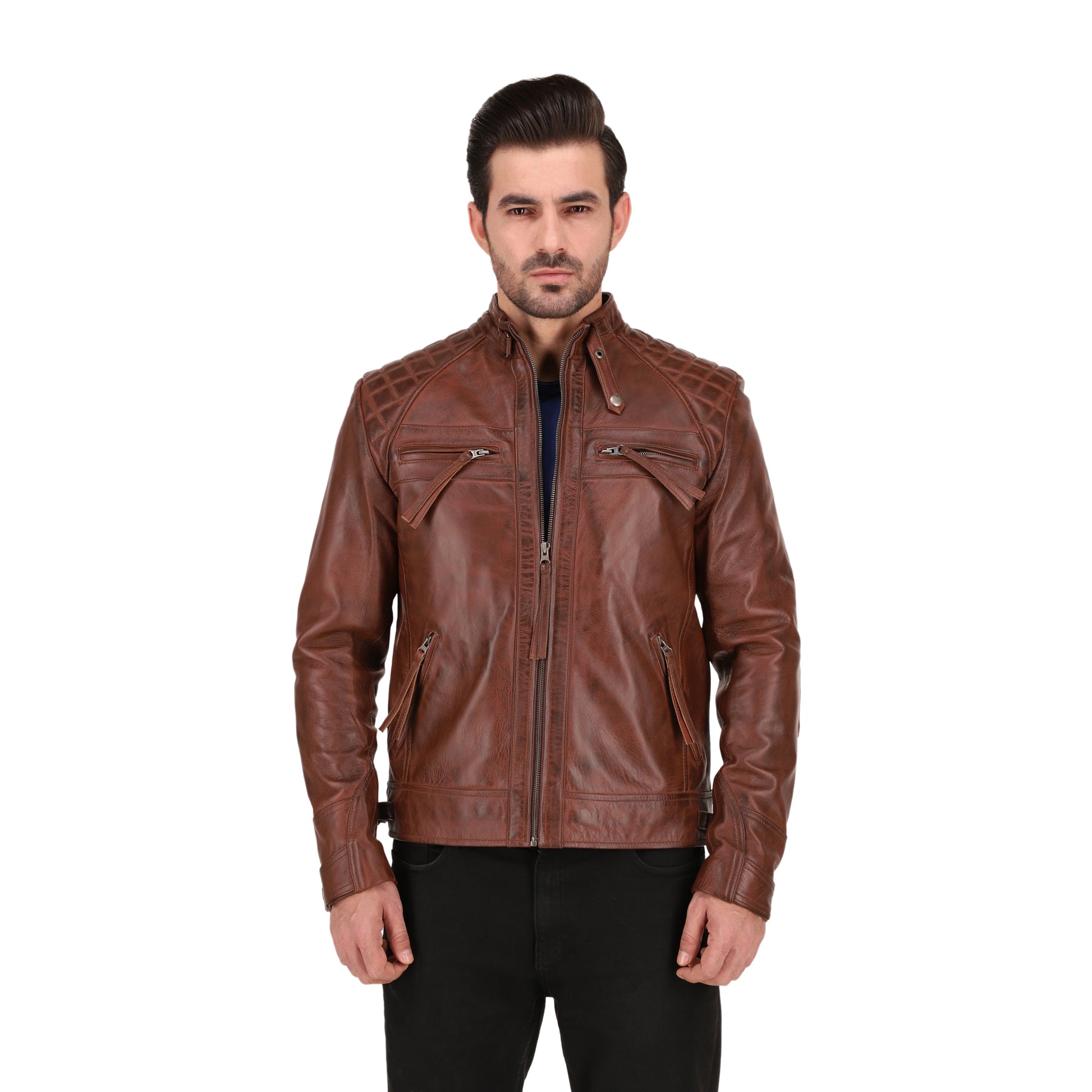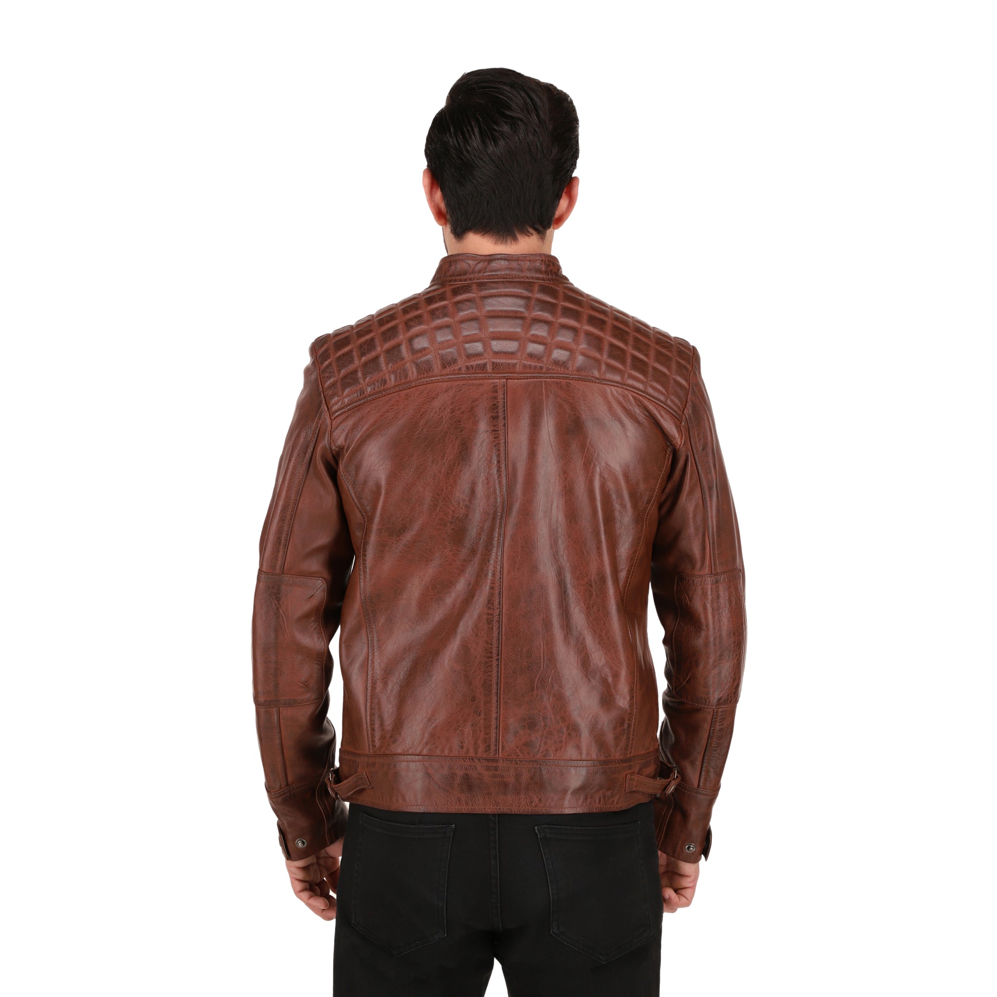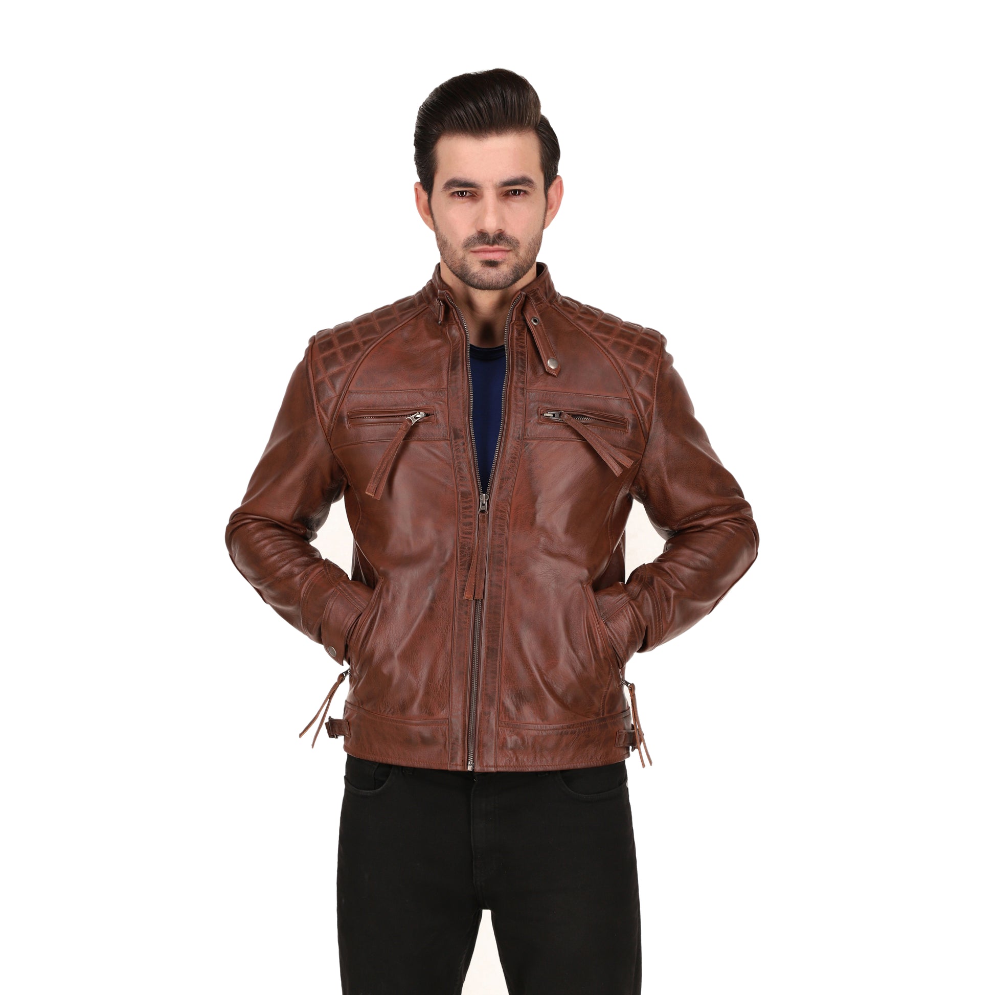 Men's Cognac Brown Quilted Cafe Racer Leather Jacket