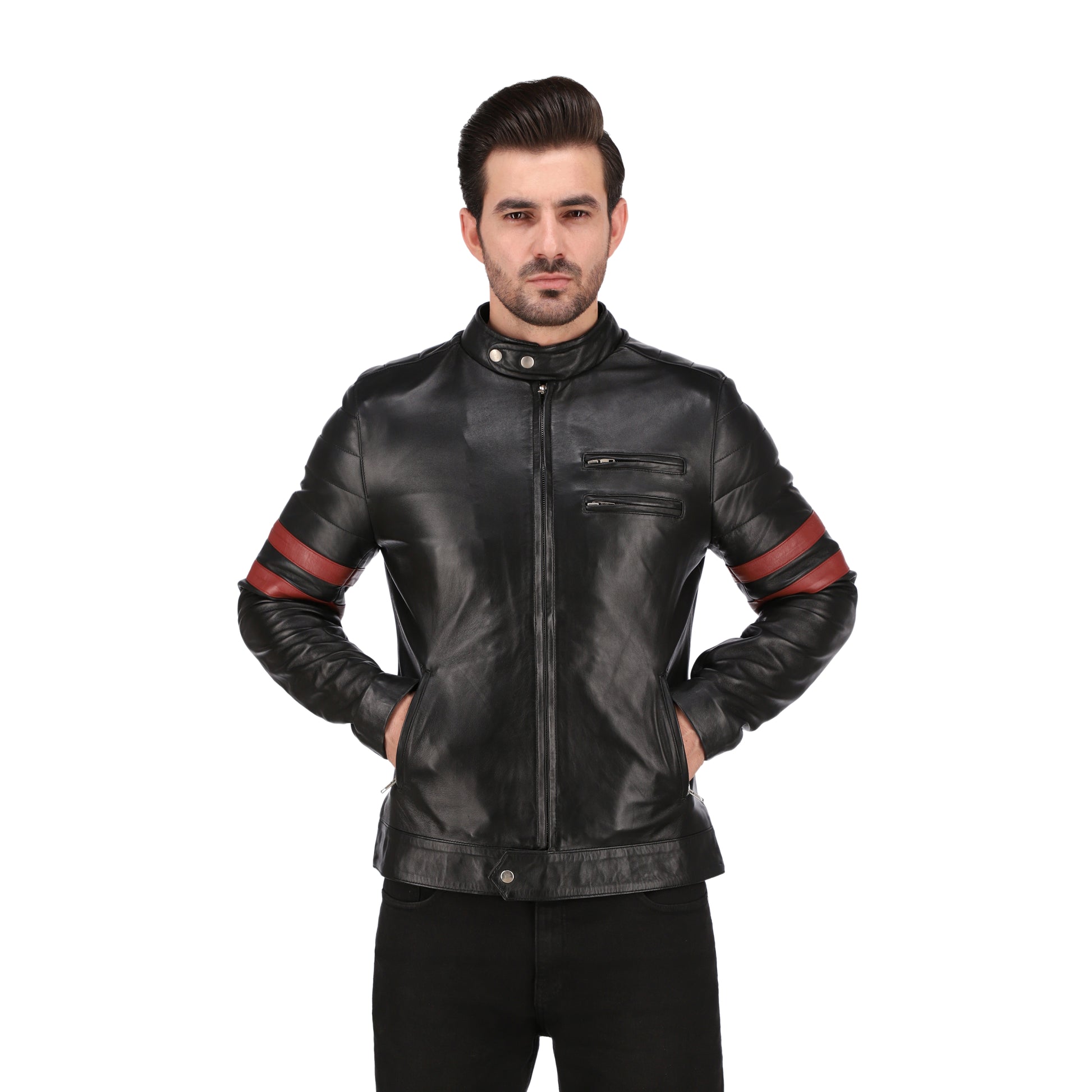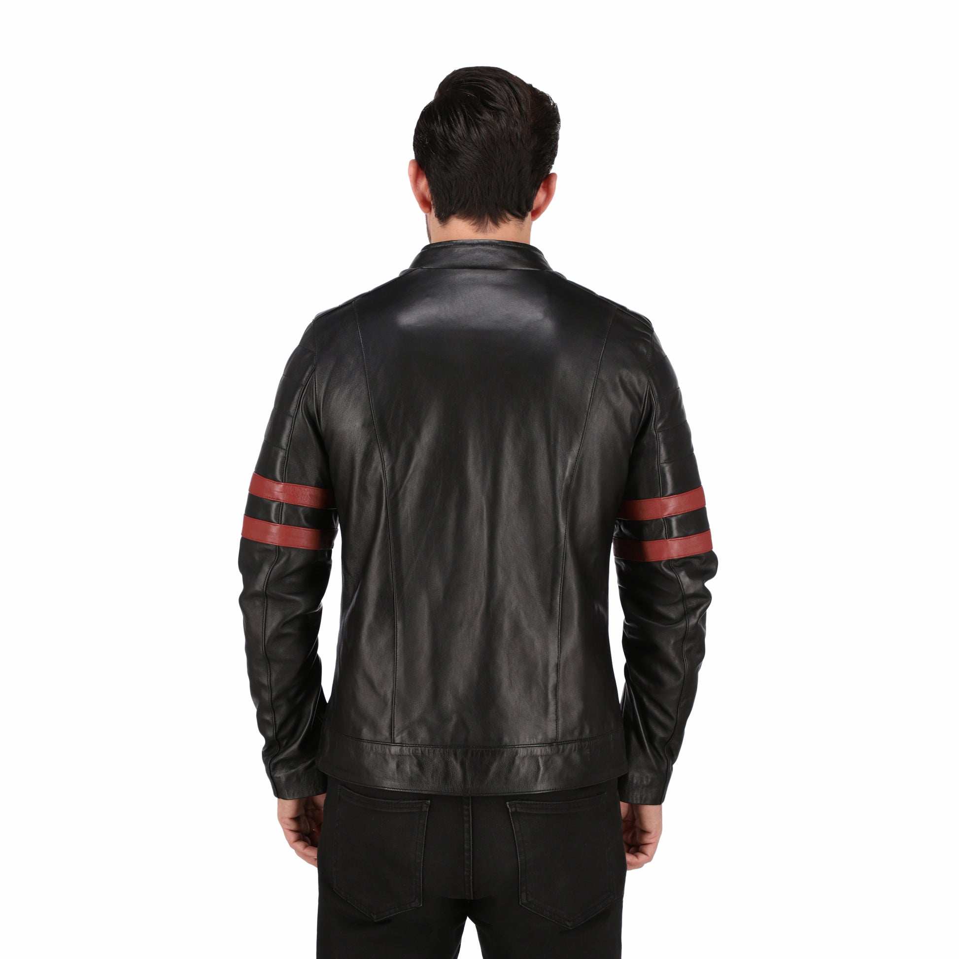 Men’s Red Stripes Black Real Leather Biker Jacket