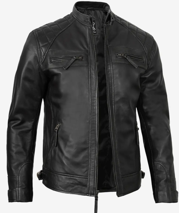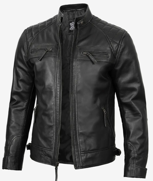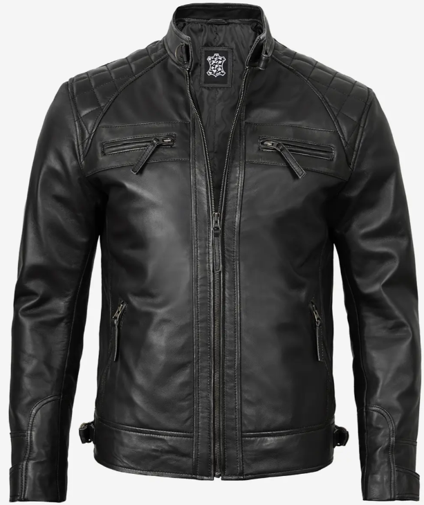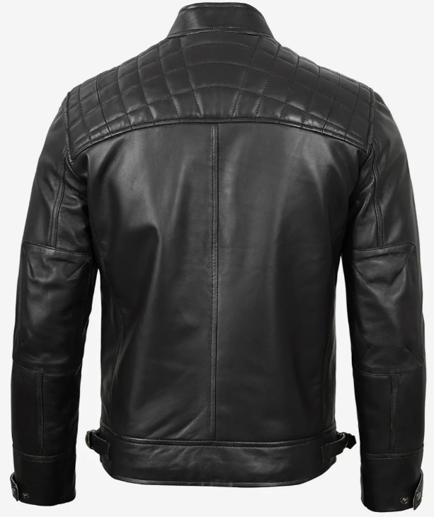 Men's Quilted Shoulder Black Cafe Racer Leather Jacket