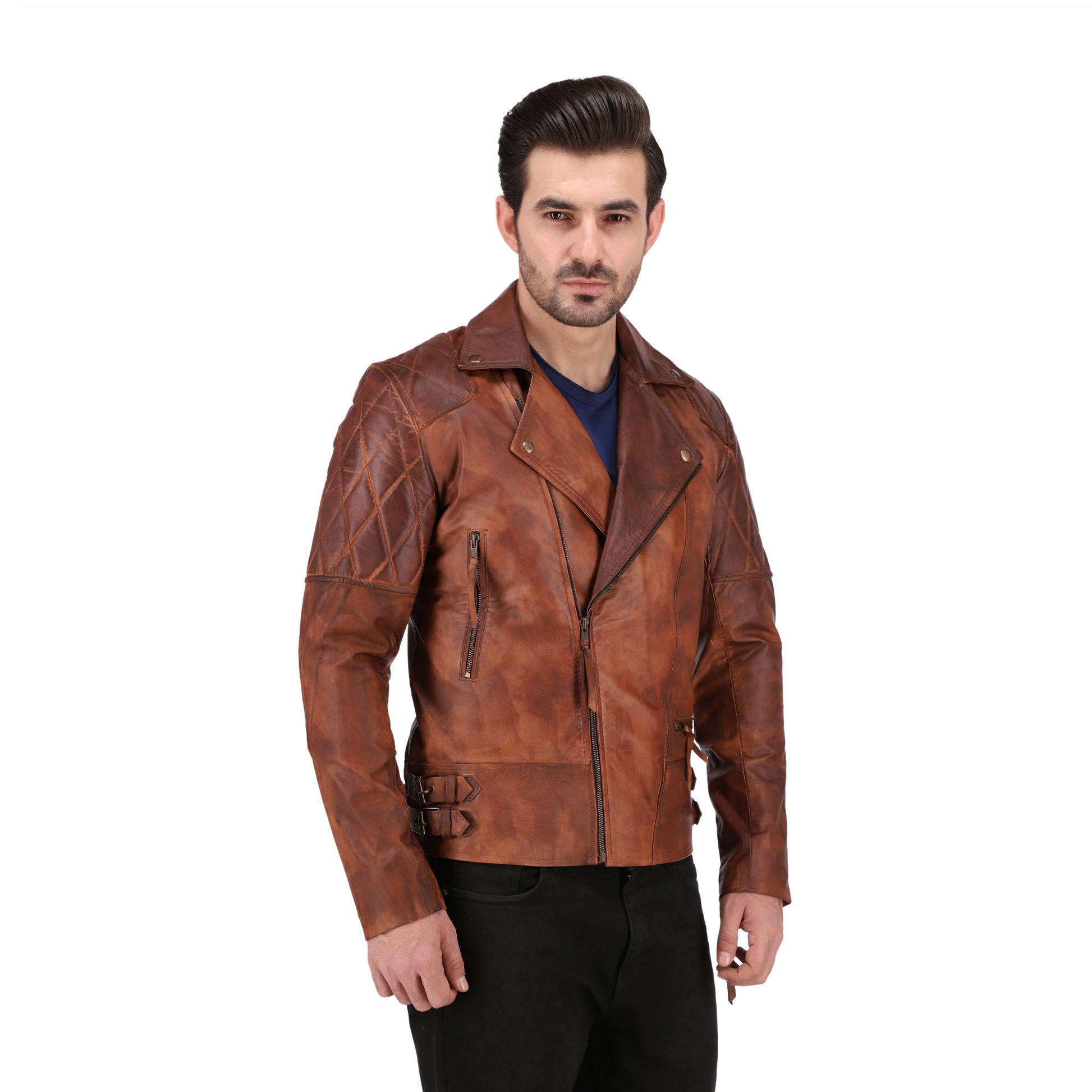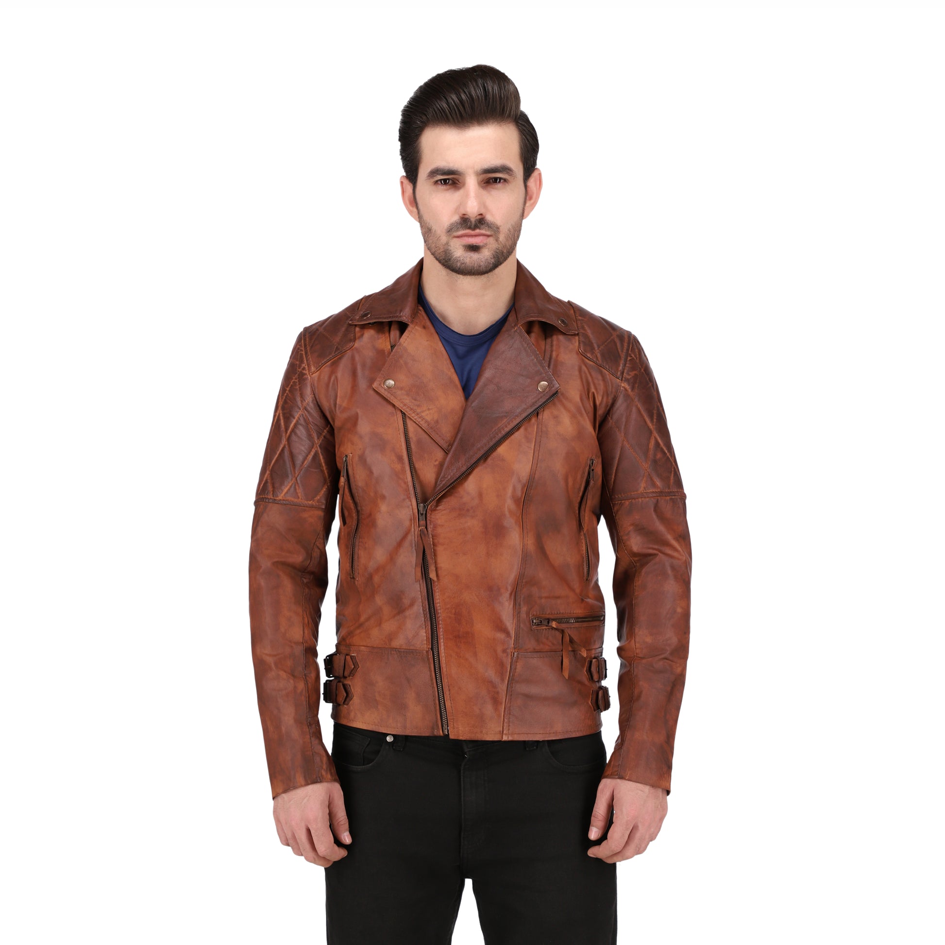The Mens Distressed Tan Brown Quilted Asymmetrical Leather Biker Jacket – a fusion of rugged elegance and contemporary style designed to set you apart from the crowd. This leather biker jacket is masterfully constructed with high-quality materials, making it a versatile staple for the contemporary gentleman's wardrobe.