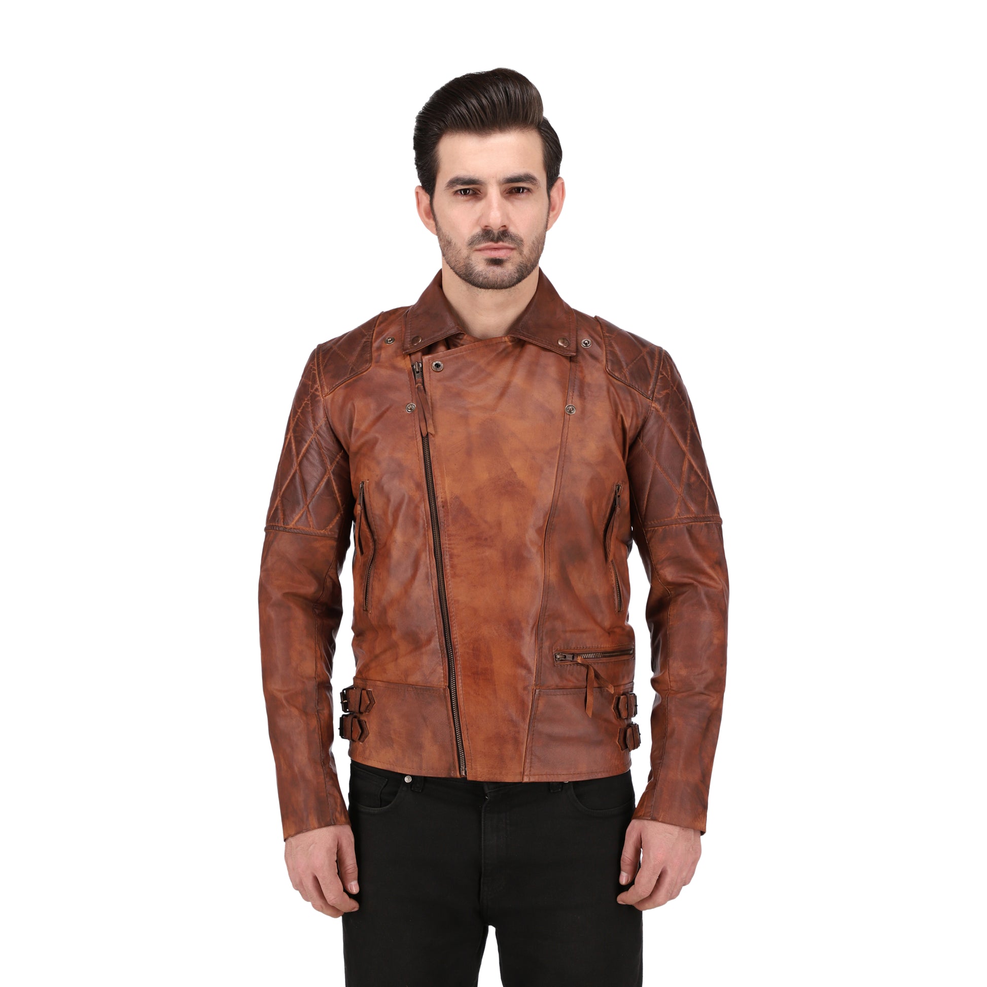 Mens Distressed Tan Brown Quilted Asymmetrical Leather Biker Jacket